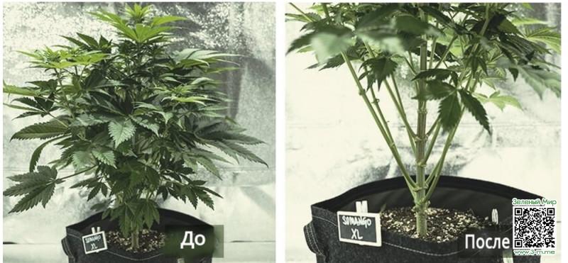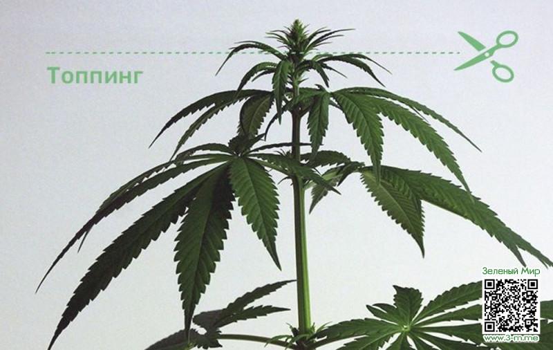 Обрезку каннабиса проводят острыми ножницами, выполняя всего один вертикальный срез ниже основания макушки. Ее срезают полностью, оставляя лишь ветвь, на которой она росла. В результате после восстановления растение отращивает на ее месте две новых колы. Растение перераспределяет гормоны роста, стимулируя тем самым рост второстепенных побегов. В результате развитие куста в вертикальной плоскости приостанавливается. Он начинает развиваться вширь, становясь пышнее и раскидистее. Это приводит к появлению большого количества соцветий.