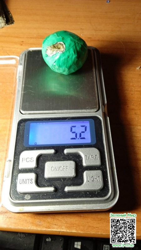 Сверток зеленая изо лента в виде шарика,+ фольга.И при такой упоковки,клад все равно был поврежден грызуном.