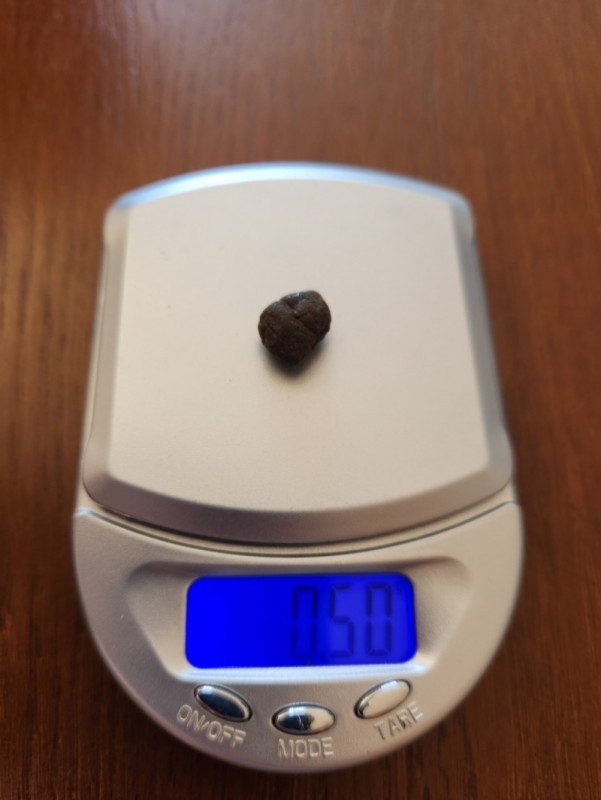 В упаковке встретил меня довольно тёмный гашиш, в количестве пол грамма ровно, судя по весам. Запах явный, но не сильно резкий, тяжеловато-смолянистый, тёплый летний аромат смол каннабиса, при ближайшем рассмотрении также отдаёт хвоей, итоговая вонючесть примерно 6.5/10, тот же KINI, как по мне, воняет ощутимо больше.