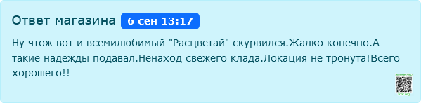 Напишем по делу и один раз.Дабы все имели полную картину! После этого, сообщений более не будет! Дядя /user/view?nick=Horus не ожидали когда Вы сами написали еще полтора месяца назад и сказали что магазин полное "фиаско".Ну не понятно зачем вновь пришли к нам.Ну жтож скурвились,скурились и т.д. А какие были надежды. Думали щас "Расцветай" перевернет вам мир и сознание.Но нет, стал как и все магазины.Так может быть проблема не в магазинах, а в завышенных ожиданиях. На разных этапах работы, бывает всяко.Но при этом мы остаемся людьми. В общем вы купили 4 раза по 1гр.2 из 4,были магниты.Остальные тайники.Почему то Вы это не написали.А ну да! У нас же только плохое помнят! По первому тайнику- заказу вернули вам средства. С пониманием! Но две дырки подряд это уже перебор.О чем мы сразу вам и написали.Хотя вы Дядя со стажем.А создавая спор даже и фото не сделали.Хотя знаете прекрасно все правила.Даже модератор не смог расмотреть ваш спор.Ну как то не серьезно! Но кто у нас берет все знают что и как получат, не больше не меньше!
