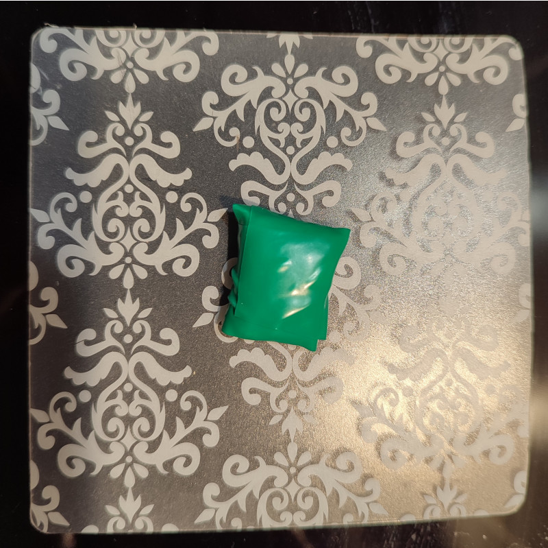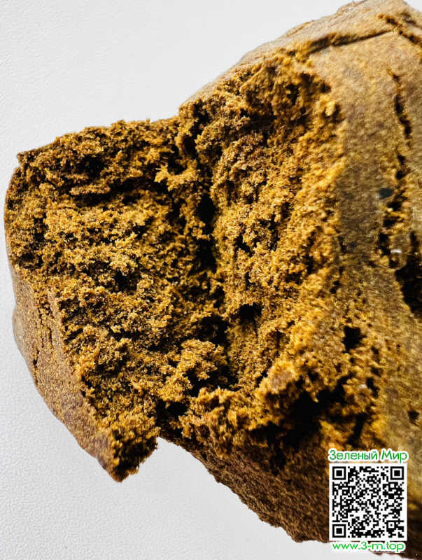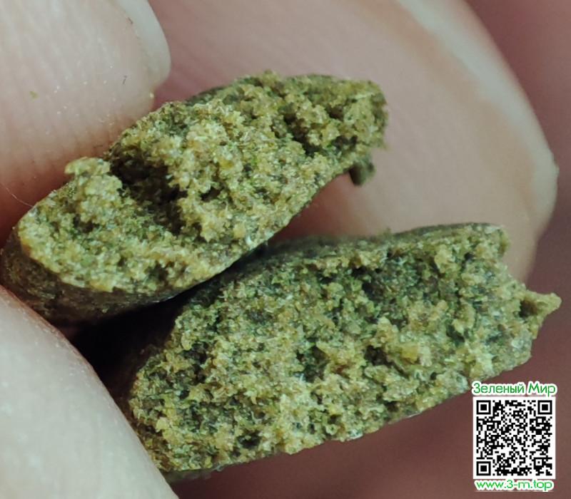 Цвет натуральный зелёный, а на разломе видны трихомы в зернистой структуре податливого хэша, которому легко придать нужные размер и форму.